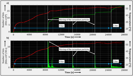 AE signals with an amplitude value greater than 50 dBAE during agitator vessel system operation with abrasive particles in the barrier fluid system; (a) cumulative number of hits; (b) number of hits that occurred over the course of the previous 30 s.