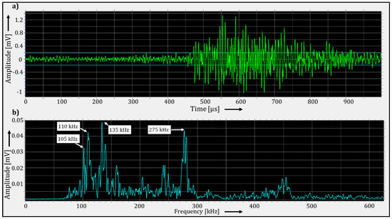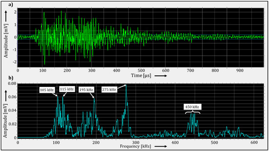 A hit was randomly selected from the hits with a greater amplitude than 50 dBAE and that occurred during the abrupt increases of AE activity. Its time signal and frequency spectrum are shown in Figure 12. The frequency spectrum exhibits a general excitation of the frequencies between 100 and 625 kHz. In particular, high amplitude peaks occurred at approximately 105, 115, 195, 275 and 450 kHz. This frequency pattern was found in other hits that occurred during the abrupt increases of AE activity.