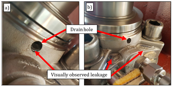 Close-up of the mechanical seal with leakage in the drain hole of the seal housing; (a) during the induced cooling failure; (b) after the reestablishment of the barrier fluid supply.