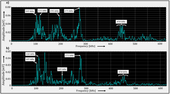 Comparison between two frequency spectra of different measurements; (a) frequency spectrum of the hit depicted in Figure 12; (b) frequency spectrum of a detected hit after the barrier fluid supply was restored when simulating a cooling failure.