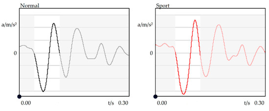 For variation of the tactile impulse, the suspension variants normal (low damping) and sport (high damping) were mapped by a defined damper parameterization (Active Suspension Management). Figure 2 shows the resulting accelerations (filtered) at the driver’s seat in the vertical direction for the respective suspension parameterizations when driving over obstacles with the rear wheels. The objective evaluation resulted in about a +12.5% (standard deviation SD < 4%, see Appendix B) increased impulse input (peak-to-peak value) in the sport suspension mode (Table 1), which could be distinguished subjectively (see Appendix B for additional information regarding data acquisition and data analysis).