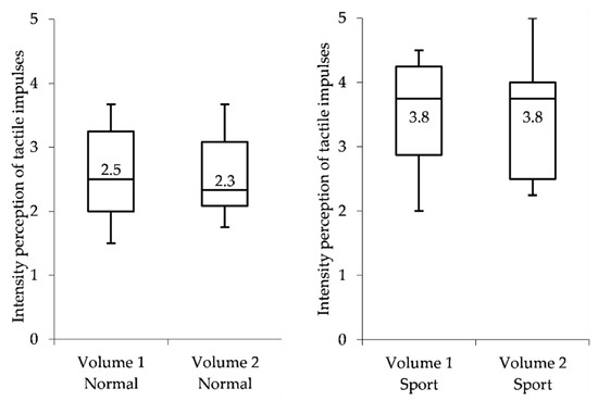 Intensity perception of tactile impulses in the suspension mode normal (Left) and in the suspension mode sport (Right) for two volumes, rating scale ranging from 0 “not perceptible” to 5 “very strongly perceptible”.