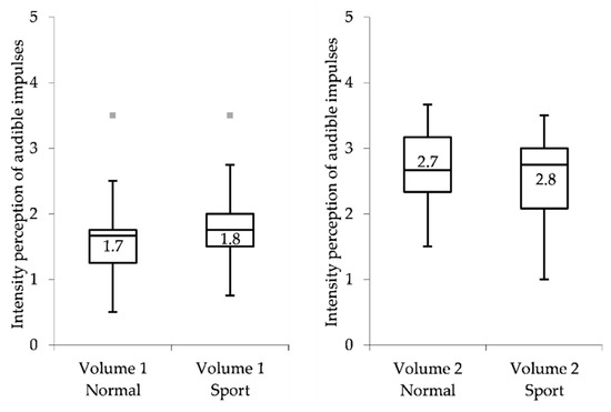 Intensity perception of audible impulses for volume 1 (Left) and for volume 2 (Right) in the two suspension modes normal and sport, rating scale ranging from 0 “not perceptible” to 5 “very strongly perceptible”.