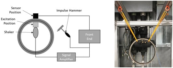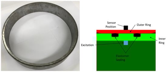 The fixture used reproduces the static stress condition of the elastomer sealing rings and ensures that they are in the intended assembly condition. Two concentric cylinders made of steel are used for this purpose. The inner cylinder has two grooves into which the elastomer sealing rings are expanded and positioned. Then the inner steel ring—together with the elastomer rings—is inserted into the outer steel ring. The final state is depicted in Figure 2. The fixture for measuring the elastomer sealing rings is freely suspended from a fixed steel frame using elastomer expanders. An impulse hammer and a high frequency miniature shaker serve as excitation sources. As depicted in Figure 3.