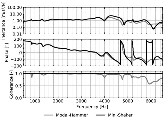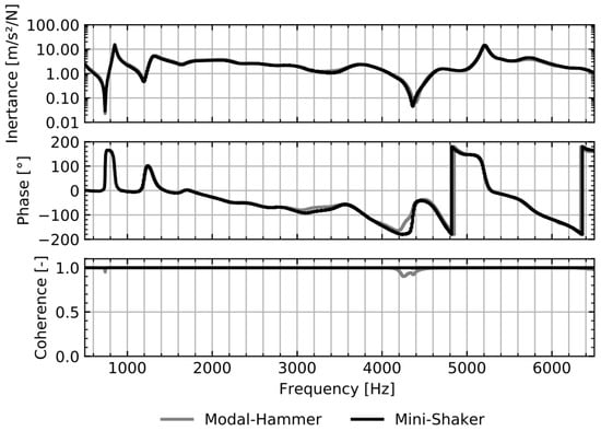 The relative comparison of the excitation sources shows that the coherence of the impulse hammer decreases for higher frequencies. This makes the plausibility of the measurement results—obtained with a modal hammer—more difficult. An assessment of the behaviour in the frequency spectrum beyond 6.5 kHz still has to be done and will be part of future and further investigations. It is expected that the coherence of the impulse hammer will continue to decrease. Therefore, the shaker excitation is recommended. For the shaker excitation, no drops in the coherence are observed. This leads to an increased confidence in the quality and accuracy of the obtained results.