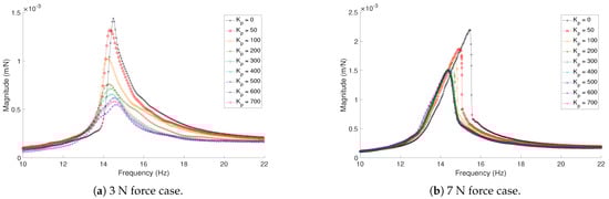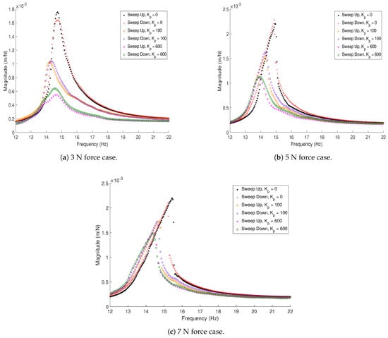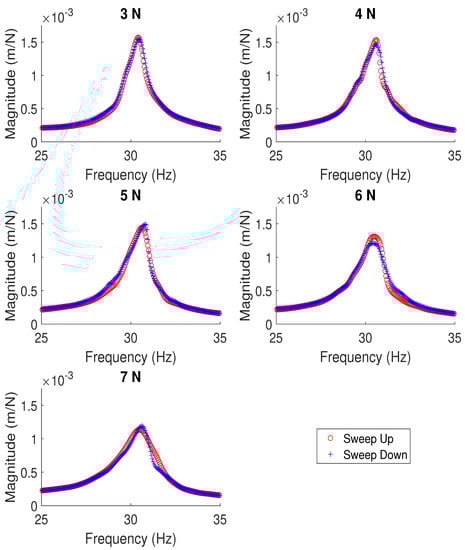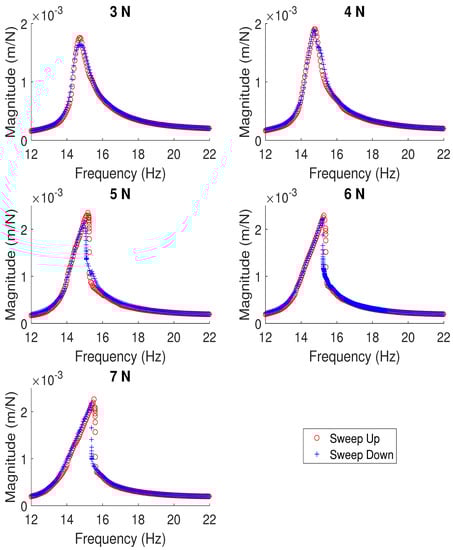 - For the case of nonlinear systems with multi-solution responses, care should be taken to select the proper set of measured data to reduce the effect of noise. Indeed, using the upper stable branch of the solution may lead to minimising the effect of noise in the results of optimisation. For instance, in the case of hardening nonlinearity, the upper branch, which in the experiment is obtained via the forward sweep test, is used for the optimisation. Therefore, it is important to take this criterion into consideration not only in the stage of data selection but also before carrying out the vibration tests. The simulated response is selected according to the selected experimental data.