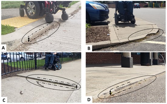 Wolf et al. demonstrated that EPW users experience about 0.1–0.5 m/s2 when driving on flat surfaces composed of brick pavers and the RMS increases with surface gaps and speeds [12]. Further, Duvall et al. evaluated the RMS vibration exposure of commercial EPWs in relation to sidewalk surface roughness [10]. Their results recommended a roughness index threshold of 5.0 cm/m or an RMS vibration of 1.2 m/s2 for sidewalks longer than 30.5 m. These studies evaluated flat but uneven surfaces typically found on sidewalks and traversed by wheelchair users. It is important to address WBV exposure on other surfaces that EPW users commonly commute on but that may not meet the American with Disabilities Act Accessibility Guidelines (ADAAG) [13]. For instance, curb-ramps provide a surface transition between intersections and elevated sidewalks for wheelchair users. However, Bennet et al. found that only 21 out of 79 intersections in Nova Scotia, Canada had a smooth transition from curb-ramps to gutters (<1.3 cm) and only half of these meet the maximum slope requirements (<4.9°) [14] (Figure 1). The ADAAG guidelines state that obstacles should be no more than 1.3 cm in height for accessibility, regardless of flat or inclined surfaces. Driving on these surfaces may cause higher WBV magnitudes relative to smooth flat surfaces (e.g., a concrete surface). No studies were discovered evaluating the WBV exposure in EPWs on these surfaces.