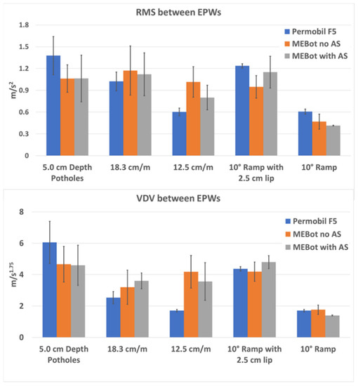 In terms of WBV differences between surfaces, it was found that potholes caused significantly higher RMS values on the commercial EPW compared with the 12.5 cm/m surface roughness (p < 0.001) and the 10° ramp without threshold (p < 0.001) (Table 1). Additionally, the 10° ramp with a threshold showed higher RMS values on the commercial EPW compared with the 12.5 cm/m surface roughness (p = 0.002) and the 10° ramp without a threshold (p = 0.002). However, there were no significant RMS differences between surfaces when using MEBot with or with no AS (Figure 6).