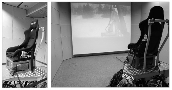The stimuli were reproduced in the Multi Modal Measurement Laboratory of Technische Universität Dresden [20]; see Figure 1. With this laboratory, it is possible to present simultaneous visual and vibro-acoustic stimuli to participants. Whole-body vibration stimuli from lower-frequency vibrations were reproduced with a six-degree-of-freedom hydraulic motion platform (Hagenbuch Hydraulic Systems AG, Ebikon, Switzerland) with a vehicle seat on it. The platform was expanded by an electrodynamic shaker (ESE 201 Typ 11075, VEB Schwingungstechnik und Akustik WIB, Dresden, Germany) underneath the driver’s seat, which also enabled the reproduction of higher-frequency vertical vibrations. The transfer function of the shaker was compensated with an FIR filter, depending on the subject, before each experiment.