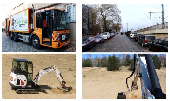 The stimuli for the investigations were recorded in a refuse collection vehicle of Stadtreinigung Dresden, Germany, and in a mini excavator; see Figure 2. The recordings in the mini excavator were carried out in a sand plant. To make recordings of the refuse collection vehicle in the city, refuse collection employees were included in the recording. Seat vibrations (Triaxial Seat Accelerometer Type 4515B, Brüel & Kjær Sound & Vibration Measurement A/S, Nærum, Denmark and Capacitive Accelerometer Type 8305B10, Kistler Instrumente AG, Winterthur, Switzerland), audio recordings in the driver’s ear position (Binaurales Headset BHS II, Head Acoustics, Herzogenrath, Germany and Microphone Type 4188 with Preamplifier Type 2671, Brüel & Kjær Sound & Vibration Measurement A/S, Nærum, Denmark) and camera shots (Camera Type EOS 750D and 800D, Canon, Tokio, Japan) were carried out from the driver’s perspective. The vibrations were measured with both sensors on the center of the driver’s seat surface.