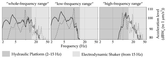 Because there are indications that a lower-level increase is more necessary for the increase in the perceived intensity of the vertical vibration than for the acoustic intensity [21], for each experiment, the average acceleration level was varied in 3 dB steps, and the average sound pressure levels were varied in 6 dB steps. The averaged sound pressure levels were based on the original levels for the refuse collection vehicle (59, 65 and 71) dBA and for the mini excavator (70, 76 and 82) dBA. The following three vibration levels were used: (109, 112 and 115) dBWk (1 × 10−6 m/s2) corresponding to (0.28, 0.40 and 0.56) m/s2Wk. The vertical vibrations were reproduced for plausible reproduction from 2 Hz. The vibrations were frequency filtered (inverse Chebyshev Filter) into three different areas: the “whole-frequency range” (2–100 Hz), high-pass filtered from 2 Hz, a “low-frequency range” (2–10 Hz), high- and low-pass filtered from 2 to 10 Hz, and a “high-frequency range” (10–100 Hz), which was high-pass filtered from 10 Hz. The reproduction for frequencies from 2 to 15 Hz was carried out with the hydraulic platform, and from 15 Hz, with the electrodynamic shaker (see Figure 4). For each vehicle scene, 27 stimuli were used.
