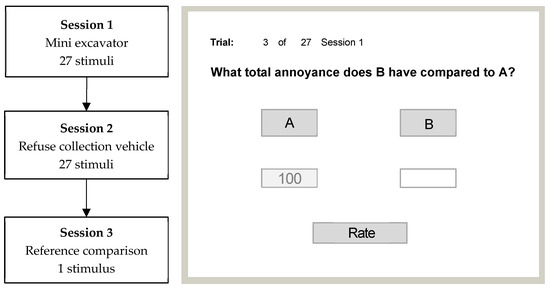 The GUI in Figure 5 was used for the participants to play and evaluate the stimuli. Magnitude estimation with a reference was chosen as the test method. The numerical value of the reference stimulus, called “A”, was 100. The test stimulus, called “B”, was evaluated in comparison to “A”. To evaluate a stimulus, the reference was first played using button “A”, and then a test stimulus was played using button “B”. The participants entered their evaluation in the empty field and then loaded a new stimulus using “Rate”. Because of two different visual contexts for each commercial vehicle, shown in Figure 2, and to investigate the relative total annoyance, each vehicle scene was evaluated in a separate session with a separate reference stimulus corresponding to the scenes, consisting of noise, vertical seat vibrations and a video clip. Both reference stimuli, one for each scene, consisted of the medium sound and acceleration levels and the signal with the widest frequency band, i.e., “2–100 Hz”. The video clip for each stimulus, meaning the test and reference stimulus, was always the same in each session. The whole experiment was divided into three sessions, which were carried out one after the other: first, 27 mini excavator scenes were evaluated in comparison to [1] (Session 1), and then, 27 refuse collection vehicle scenes were evaluated in comparison to [2] (Session 2). In the third and last session in this experiment (Session 3), the two references were compared, and the refuse collection vehicle was the reference in this comparison. The stimuli of session 1 and session 2 were presented in a randomized order.