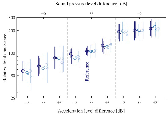 Post hoc analysis (Bonferroni-adjusted) showed that all levels of the sound pressure level differences within both scenes differed significantly from each other (p < 0.001). The acceleration level difference also showed a significant influence on the total annoyance in the conducted scenes (F(1.251,13.761) = 25.018, p < 0.001, Ƞ2p = 0.695) and (F(1.136,12.493) = 35.076, p < 0.001, Ƞ2p = 0.761). All level steps within the refuse collection vehicle scene differed significantly from each other (p < 0.001). For the mini excavator scene, the lowest (−3 dB) and the highest (+3 dB) as well as the middle (0 dB) and the highest (+3 dB) acceleration level conditions differed significantly from each other. According to Cohen [22], the strength of both of the main effects “sound pressure and acceleration level” for both scenes could be classified as strong.
