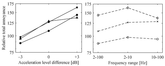 The refuse collection vehicle scene contained more low vibration frequency components than the other scene (see Figure 3). This significance suggests the influence of the frequency range depending on the acceleration level. Figure 8 shows this possible interaction. This would mean that signals that only contain vibration frequency components from 10 Hz (10–100 Hz) lead to less annoyance at stronger acceleration levels than signals that only contain vibration frequency components below 10 Hz. However, since the vertical vibrations of the stimuli had the same frequency-weighted acceleration level, this would mean that the frequency weighting for high-vibration frequencies is overestimated by the Wk-weighting and that Wk-weighted vibrations are perceived as more annoying than they are. In the literature [17,23], however, especially high frequencies seem to have more annoying characteristics than suspected in the actual Wk-weighting of ISO 2631-1 [4].