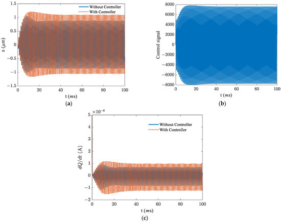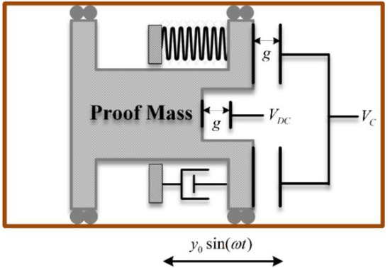 where M, k, and b refer to the mass, stiffness, and damping coefficient of the oscillator, respectively; is the amplitude of the base excitation, is the frequency of the base excitation, t denotes the time, A is the surface of the proof mass exposed to the VDC and VC, and Q is the charge on the capacitors plate due to the DC electrostatic voltage; g is the initial gap between the proof mass and the fixed plates of the capacitors and R is the load resistance connected to the energy harvester. Equations (1) and (2) are simultaneously integrated over time to capture the time response of the system. For this, the phase space variables, including the position, velocity, and electrical current, are defined in terms of the first-order differential equations and numerically integrated over time [1].