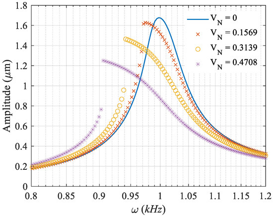 In cases where the base excitation frequency is not sufficiently accommodated in the resonance region of the energy harvester, we would neither expect the maximum possible amplitude nor the harvested power, unless we apply an appropriate electrostatic voltage to push the resonance region leftward and activate the resonance mode. Based on Equation (5), by increasing the applied DC voltage, the equivalent stiffness of the harvester decreases and, for a given applied voltage called pull-in voltage , dynamic instability occurs. The frequency response curve of the proposed energy harvester exposed to various VN is provided in Figure 3. (Considering pull-in voltage, the applied electrostatic voltage is normalized with respect to = 31,861 v and is denoted by VN). By increasing VN, the frequency response curves move leftward along the frequency axis, and the resonance region is shifted leftward accordingly.