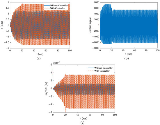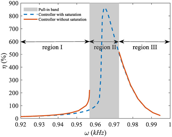 As illustrated in Figure 4, by applying electret layer voltage , sweeping the excitation frequency and activating the PID controller, the result is an undesired pull-in band (region II) in the frequency domain due to a sudden jump in the amplitude. This is attributed to the singularity of the motion equation once the amplitude of the motion approaches g. To address this issue, we imposed a saturation mechanism to bound the control signal () and accordingly avoid a pull-in band. This is illustrated in Figure 5, where the time response, feedback voltage, and current are illustrated with the excitation frequency as the left margin of the pull-in band. In region I, as the excitation frequency approaches the margin of the pull-in band, efficiency is decreased in comparison with the non-saturated control signal; this is attributed to the limited enhancement of the amplitude of the saturated control signal. Once we pass through the margin of the pull-in band and enter region III, the system exhibits similar behaviours as in region I and the efficiency varies negligibly with the saturation; this justifies the application of non-saturated control signals in both regions I and II.
