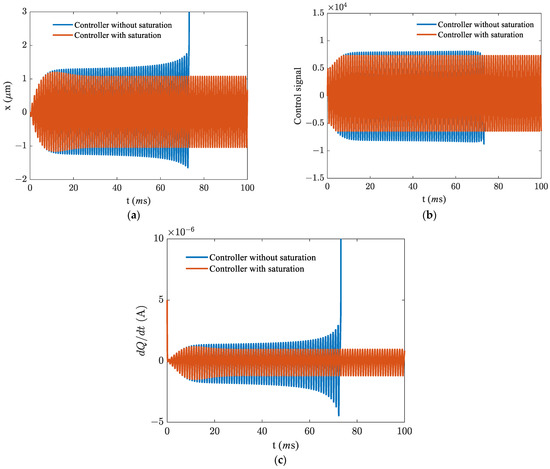 The response in the presence and absence of the saturation in the PID controller. (a) Time response, (b) feedback signal, and (c) current.