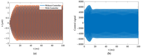 As illustrated in Figure 1, the case study is a single degree of freedom capacitive energy harvester with an actively tuned natural frequency. The energy harvester is exposed to a harmonic base excitation with frequency and amplitude. As illustrated, the proof mass is exposed to an electret layer with a voltage and two electrodes on either side of the electret layer, which are activated by the output of a PID controller. By applying Voltage () to these electrodes, the resonance frequency of the harvester can be tuned through the softening effect of the electrostatic force.