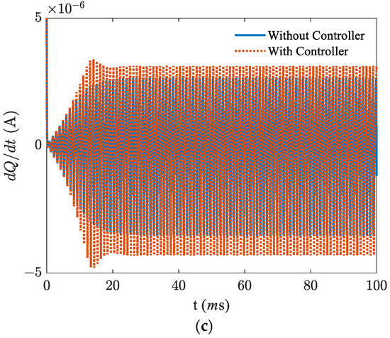 The response in region III, in the presence and absence of the saturation in the PID controller. (a) time response, (b) feedback signal, and (c) current.