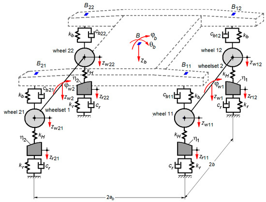 On the model in Figure 1, five bogie reference points, B and Bbjk, are marked. The point B is located against the bogie center, whereas the points noted as Bb11, Bb21, Bb21, Bb22, are on the bogie frame, against the support points on the suspension corresponding to the wheels with the same indices.