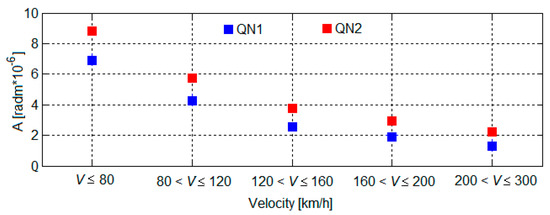 Figure 4 features the values of AQN1,2 calculated as per Equation (40), where σηQN1,2 has been assigned different values corresponding to a track of quality QN1 and a track of quality QN2, as per UIC 518 Leaflet (see Figure 3).