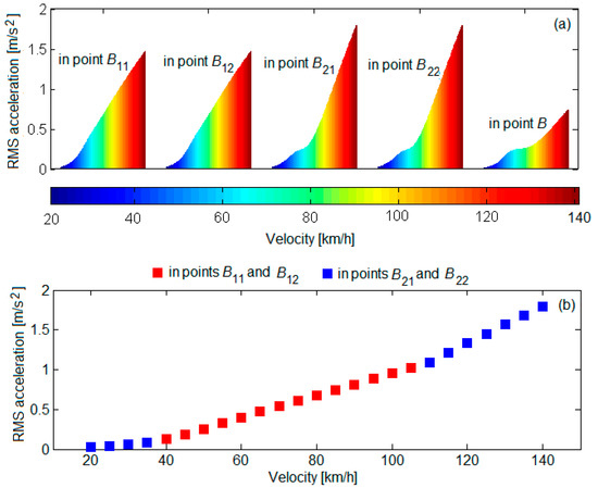 RMS acceleration in the bogie reference points: (a) velocity influence upon RMS acceleration; (b) velocity influence upon the critical point of the regime of vibrations of the bogie.
