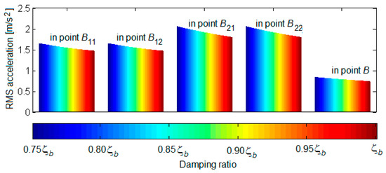 An initial evaluation of the influence of suspension asymmetry upon the dynamic behaviour of the bogie considers the reduction in the damping ratio of the suspension. According to the RMS acceleration values calculated at a velocity of 140 km/h, as in Figure 8, the reduction in the damping ratio of the suspension results in an increase in the level of vibrations in all the reference points of the bogie. For instance, a rise of 12.3% of RMS acceleration in the reference points B11 and B12 and of 14.4% for the RMS acceleration in the reference points in B21 and B22 can be noticed, should extreme values of the RMS acceleration be taken as reference, namely the ones corresponding to the limit values of the damping coefficient (ζband 0.75ζb). In the reference point B, the RMS acceleration increases by 13.5%.