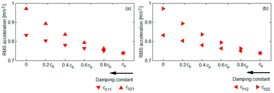 Influence the reduction the damping constant of the suspension upon RMS acceleration in point B, at a velocity of 140 km/h: (a) reduction in the damping constant of the suspension in wheels 11 or 12; (b) reduction in the damping constant of the suspension in wheels 21 or 22.