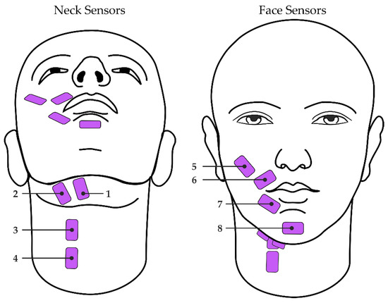 Configuration of sEMG sensors (pink) on the neck (left; sensors 1–4) and face (right; sensors 5–8).