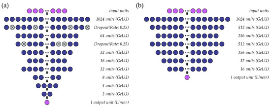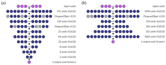 A schematic representation of the single-speaker models for fo and intensity can be found in Figure 2. The hidden layers within both models use the GeLU activation function. Parameter optimization for the fo (Figure 2a) and intensity (Figure 2b) models is performed at a learning rate of 0.001 (batch size: 1024) and 0.005 (batch size: 2048), respectively, using the ADAM optimizer. As the models are intended to solve a regression problem, mean squared error is used as a loss function. Accordingly, the output layer for each model comprises one unit with a linear activation function. In the models for fo, all fo values (predicted, observed) are standardized to semitones (ST) relative to a reference value based on the speaker’s average fo. Both models are deep regression neural networks that predict outcome values at a resolution of 0.01 ST (fo) or 0.01 dB SPL (intensity).