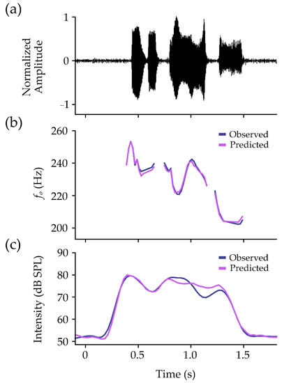 Results for intensity also showed MAPE values under 5% for all participants (M = 2.38%, SD = 0.97%). Pearson’s r and Lin’s CCC values were over 0.94 for all participants, showing mean values of r = 0.97 (SD = 0.01) and CCC = 0.97 (SD = 0.01). The RMSE between observed and predicted values was 3.25 dB SPL (SD = 1.18 dB SPL), with MBE averaging at 0.21 dB SPL (SD = 0.85 dB SPL). An example of observed and predicted contours is shown for intensity in Figure 4c.