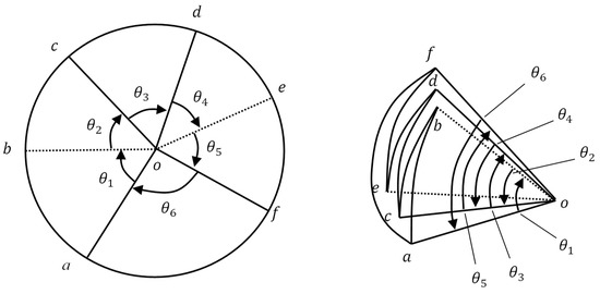 As shown in Figure 3, assuming six-fold lines , , , , , and F drawn from the center point of a sheet of paper, its solid line represents a mountain fold, and its dotted line represents a valley fold. The angles composed by each fold line are , , , , , and . The requirement for the paper to be folded flat is expressed as follows [37].