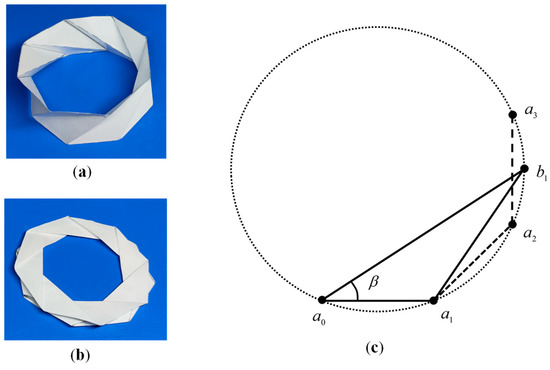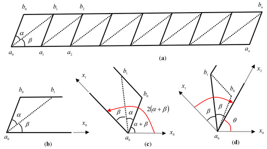 Next, the axial direction was rotated in the negative direction at the angle of , with as the fold axis and the valley fold in the opposite direction, as shown in Figure 5d, resulting in a new axial direction of . Because of the two folds of the left-most segment, the original angle of rotation of the flat strip of paper in the axial direction is expressed by the following equation.
