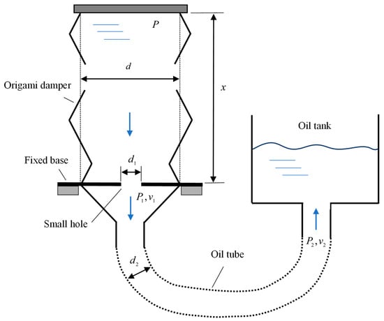 The damping effect of the origami hydraulic damper, shown in Figure 7, consists primarily of the resistance produced by the internal hydraulic oil as it flows through the orifice hole at the lower end of the origami hydraulic damper and the oil tube.