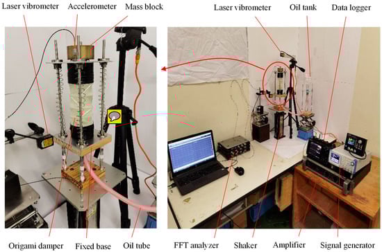The displacements of the bottom fixed base and top-end surface of the origami hydraulic damper were detected using a laser displacement meter and recorded by a data logger. Meanwhile, the acceleration signal of the top-end surface of the origami hydraulic damper was measured by an accelerometer and recorded by an FFT analyzer. Finally, the measured vibration response results were processed and delivered using a computer.