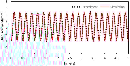 Experiments and numerical analyses were performed with the vibration model of the origami hydraulic damper shown in Figure 7 using a sinusoidal signal (frequency 4 Hz). The results of the vibration displacements are shown in Figure 13.