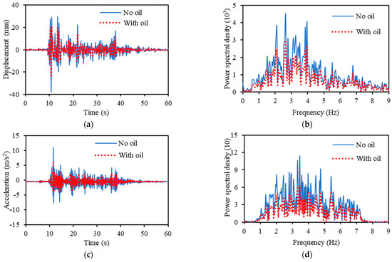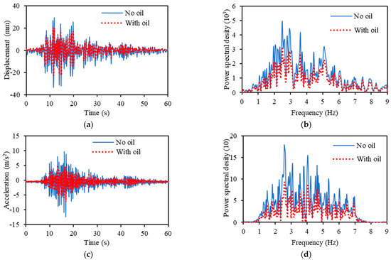 Figure 16 shows the results when shaking was measured using the EI Centro NS seismic waves. Figure 16a illustrates the response displacement of the time series; Figure 16b illustrates the results of the spectral analysis of the response displacement in the frequency domain; Figure 16c illustrates the response acceleration of the time series; Figure 16d illustrates the results of the spectral analysis of the response acceleration in the frequency domain. The solid blue line indicates the measurement results without hydraulic oil, whereas the red dotted line indicates the measurement results with hydraulic oil.