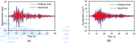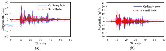 Effect of attenuation hole diameter when excited by EI Centro NS seismic wave. (a) Response displacement. (b) Response acceleration.