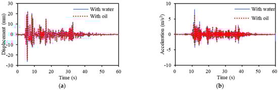 Effect of type of liquid when excited by Taft seismic wave. (a) Response displacement. (b) Response acceleration.
