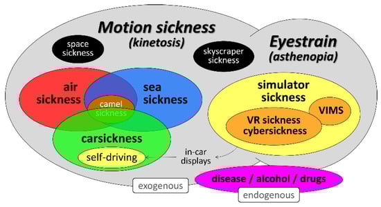 Motion sickness taxonomy reflecting the conditions in which motion sickness and eye strain can occur. Note that the symptoms of motion sickness are not only caused be external (exogenous), physical, and/or visual motion, but may also be brought about in the absence of these stressors in the case of defects within the vestibular system, causing (endogenous) motion illusions. Adapted from [56].