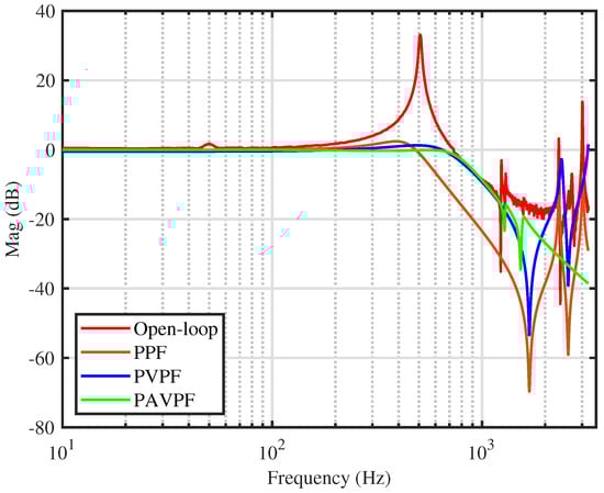 It should be noted that the damping is achieved by the Positive feedback controllers (PPF, PVPF, and PAVPF), and tracking was achieved using the integral controller. The gain of the integrator was selected numerically to deliver a maximum −3 dB bandwidth. The resulting controllers are presented in Table 1.