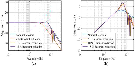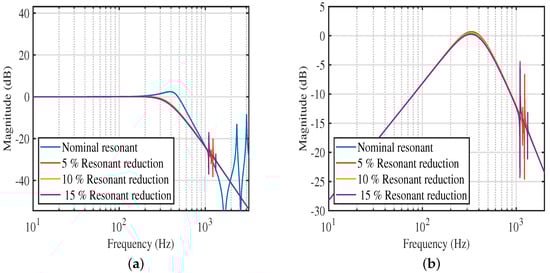 (a) Closed-loop magnitude response under resonant frequency changes for PVPF scheme; (b) Disturbance rejection profile for various resonant frequency changes for PVPF scheme.