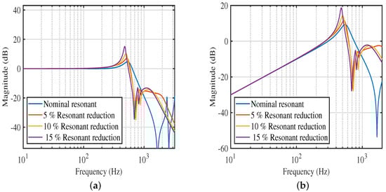 (a) Closed-loop magnitude response under resonant frequency changes for PAVPF scheme; (b) Disturbance rejection profile for various resonant frequency changes for PAVPF scheme.
