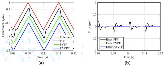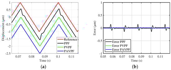(a) Time domain traces by the proposed PPF, PVPF and PAVPF controllers for 35 Hz triangular wave input; (b) Measured error by proposed PPF, PVPF and PAVPF controller for 35 Hz triangular wave input.
