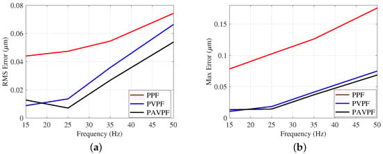 RMS error (a) and Maximum error (b) trends while tracking triangular trajectories of fundamental frequencies ranging from 5 Hz to 50 Hz and a displacement range of ±1 m for PPF + I, PVPF + I and PAVPF + I schemes designed using the presented eigenstructure assignment method.