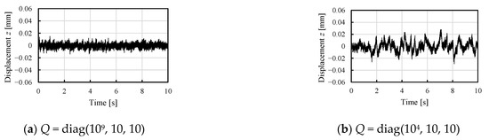 First, Table 2 shows the gap when the steady-state current is set to 1.3 A. Table 2 shows the “analytical values” obtained from the electromagnetic field analysis in Chapter 3 and the “experimental values” obtained from experiments using the magnetic levitation system. The analytical and experimental values were almost identical, indicating that the electromagnetic field analysis results were valid. Figure 7 shows the displacement of the flexible steel plate in the vertical (Z-axis) direction during the magnetic levitation. The equilibrium point was set to 0 mm in time history. Under all the conditions, the flexible steel plate was stably levitated without divergence. When the weighting factors of the velocity and current were set to greater than 104, levitation could not be achieved. Therefore, it was demonstrated that the system constructed based on the results of the electromagnetic field analysis was capable of levitation. However, the displacement of the flexible steel plate is vibratory. This may be due to the feedback of the velocity and displacement of the flexible steel plate, which is apparently a one-degree-of-freedom system consisting of a spring and damper. Figure 7 shows that the displacement amplitude depends on the combination of the weighting factors. The displacement amplitude deteriorates levitation stability. To evaluate the displacement amplitude, Table 3 lists the standard deviations of the displacement for each weighting coefficient pattern. The standard deviation of the displacement indicates the root-mean-square (RMS) displacement at the equilibrium point [32]. When the weighting factors of the displacement, velocity, and current weights were each set to 104, the standard deviation was larger, and the levitation stability degraded. In contrast, increasing the displacement weight to 109 improved the levitation stability. Therefore, it was determined that stable levitation could be achieved by setting the displacement weight coefficient to be relatively larger than the other weight coefficients.