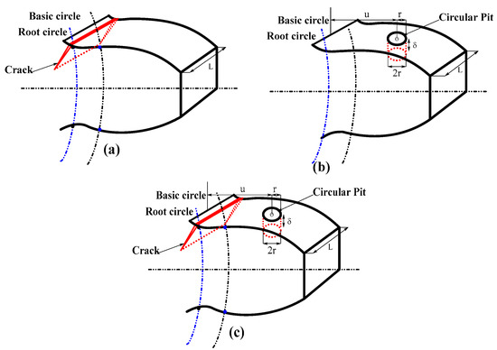 Three variables are used to express the circular pitting: the pitting depth (δ), the distance between the tooth root and the pitting circle center (u), and the circle radii of the pitting (r). Furthermore, the different top views of the affected gear tooth are presented as shown in Figure 3. At the moderate stage, Figure 3a shows the tooth failure region with a constant crack depth, and Figure 3b shows the tooth failure region with a pit depth. As a result, the coexistence of pitting and cracking is uniformly distributed in Figure 3c. This changes the effective section of the gear tooth area and the area moment of inertia, as well as the gear meshing stiffness.