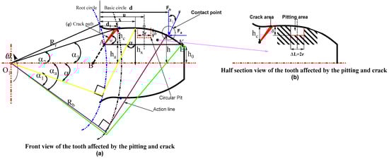 The effective tooth contact width L is not constant and decreases when the surface of the pinion tooth has pitting dispersed over adjacent teeth during meshing. Its expression changes correspondingly, and affects the expressions of , , and , all different from the ones given above for a perfect pinion tooth. , , and are used to represent the reduction of the tooth’s contact width, area, and area moment of inertia, where is the distance to the tooth root. Their expressions are calculated as follows: