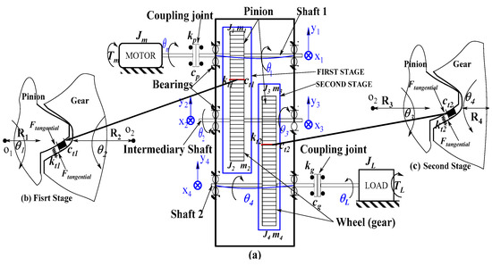 Figure 6a shows a two-stage gearbox with six bearings used to support the three shafts—shaft 1 (input), rotating at (Tm) revolution per minute, which carried a pinion of mass 1, a base circle radius 1, and moment of inertia 1 (m1, R1, J1) driven by an electric motor via an input coupling joint, which has the following characteristics: a torsional stiffness (kp) and a damping coefficient (cp); shaft 2 (intermediary), which carried a wheel of mass 2, base circle radii 2, within a moment of inertia 2 (m2, R2, J2), and carried a pinion of mass 3, base circle radius 3, and moment inertia 3 (m3, R3, J3); and shaft 2 (output), rotating at (TL) revolution per minute, which carried a wheel of mass 4, a base circle radius 4, and moment of inertia 4 (m4, R4, J4), and was connected to a torsional stiffness (kg) and a damping coefficient (cg) characterizing the load through an output coupling joint, respectively. All bearings are represented by k1, vertical stiffness, and c1, vertical damping on the input bearing; k2 = k3, vertical stiffness, and c2 = c3, vertical damping on the intermediary bearing; and k4, vertical stiffness, and c4, vertical damping on the output bearing. Figure 6b,c shows two pairs of spur gears, each with a pinion and a gear. The first stage (b) and second stage (c) are properly coupled, and the two-surface gear contact is subjected to torsional stiffness and damping forces generated by the gear meshing stiffness kt1 and damping coefficient ct1 in Figure 6b and the gear meshing stiffness kt2 and damping coefficient ct2 in Figure 6c.